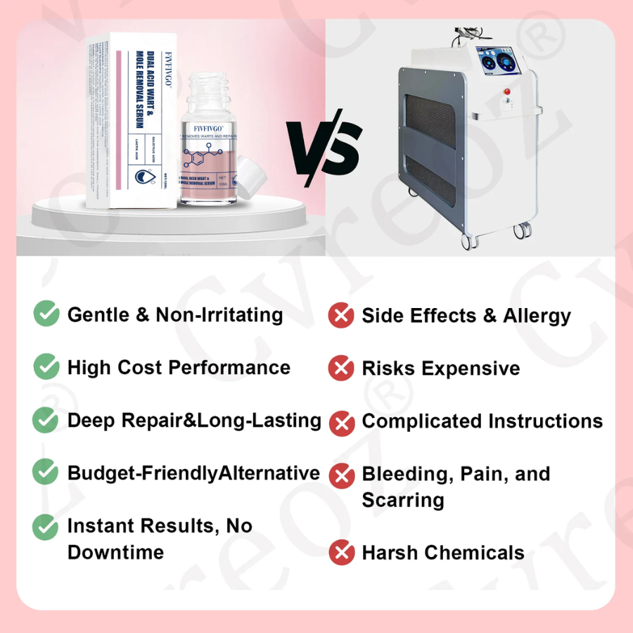 A:Fivfivgo® Dual Acid Wart & Mole Removal Serum is designed to be safe and non-invasive, with no reported side effects when used as directed. Unlike cosmetic procedures, it does not require recovery time and poses no risk of skin burns or hyperpigmentation.